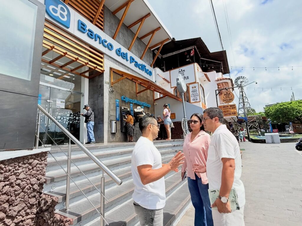 El alcalde (s) Patricio Moreta Altamirano mantuvo una reunión con la gerente comercial de la sucursal Galápagos de Banco del Pacífico, Cecilia Viera Rendón, con el objetivo de avanzar en la etapa de pruebas del sistema de pagos en línea de esta entidad financiera, que próximamente estará disponible para la ciudadanía.