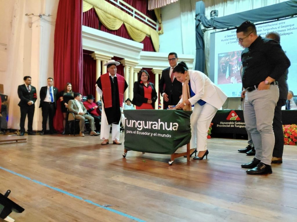 Entre las invitadas especiales destacó la presencia de nuestra alcaldesa, Fanny Uribe, quien asistió como testigo de honor a la firma del Acuerdo de Cooperación Interinstitucional entre los Geoparques Mundiales UNESCO de las provincias de Tungurahua, Napo Sumaco e Imbabura, y el Consejo de Gobierno de Régimen Especial de Galápagos.